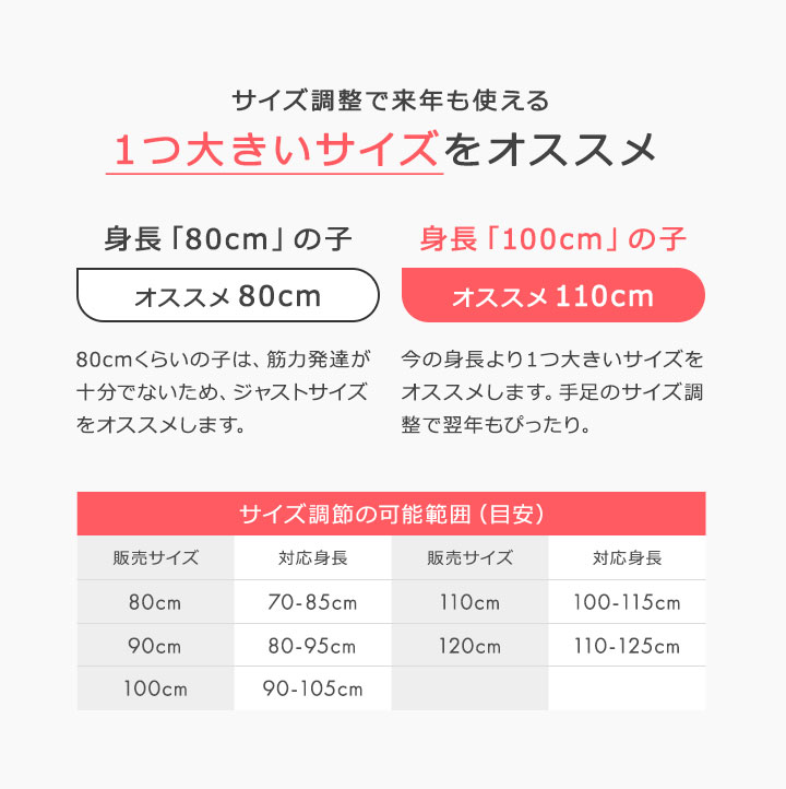 | 身長 | 70-85 | 80-95 | 90-105 | 100-115 | 110-125 |