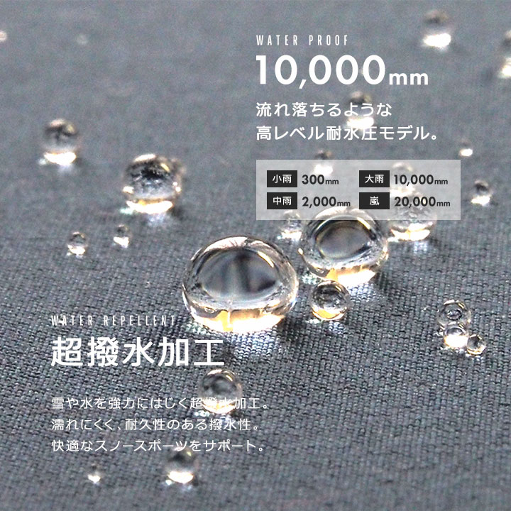 ■耐水圧10,000mm:表地は水が浸透しにくいため、身体が冷えにくい