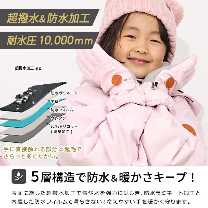 ■耐水圧10000mm:スキーウェアと同じ生地を採用!表地は水が浸透しにくい『超撥水加工』