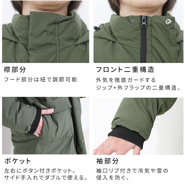■衿裏、フード裏は起毛トリコット、フード口はアジャスター調整可能。