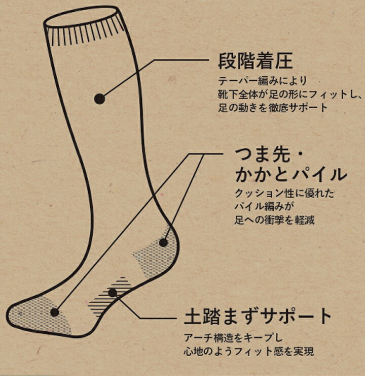・段階着圧:テーパー編みにより、靴下全体が足の形にフィットし、足の動きを徹底サポート。