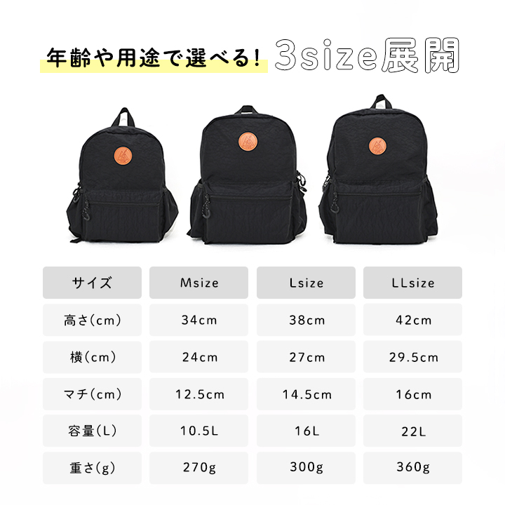 おしゃれなカラー展開でサイズもM.L.LLと3サイズあるので、兄弟や親子お揃いで使うと可愛さ倍増です。
