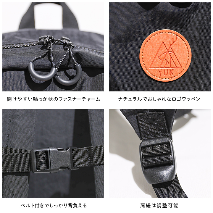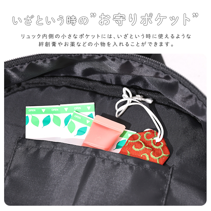 お子様でも開閉しやすいファスナーチャームを使用し、広いマチに全面とサイドにもポケットがついておりペットボトルもすっぽり入るデイバッグ。