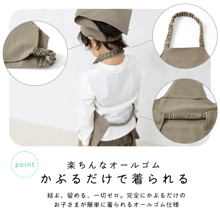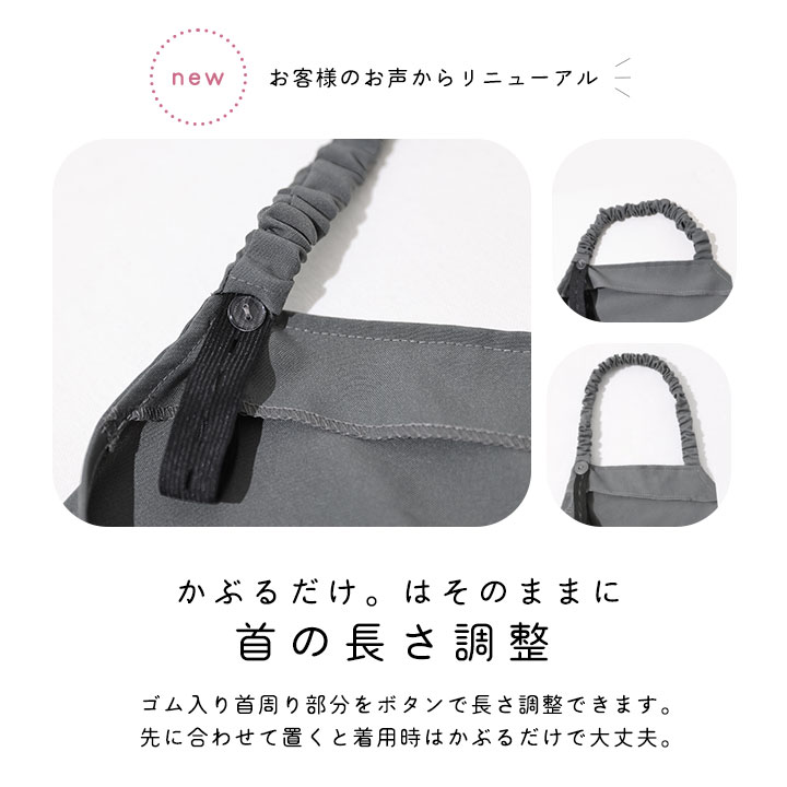 ■かぶるだけ:首後ろと背中にゆるめのゴム付きでかぶるだけで着用できます。留める、結ぶは一切無し!