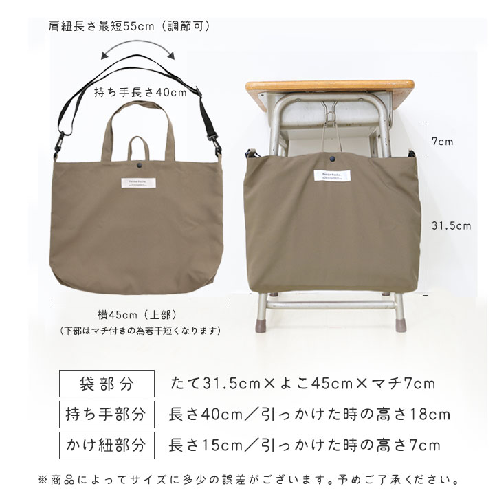 持ち手長さ40cm/かけ紐長さ15cm/ショルダーベルト最短55cm(調節・取外可)